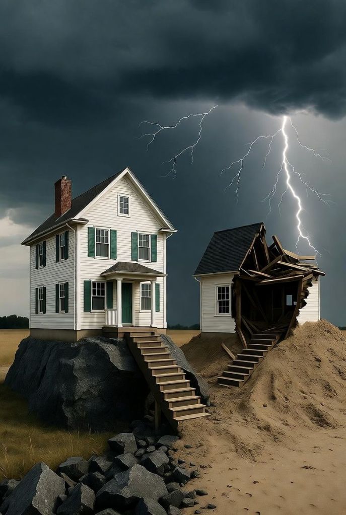 The climax reveals the fool’s downfall: the same storm strikes, but his house collapses utterly, its “great fall” evoking apocalyptic judgment in Daniel or Revelation. Good works put faith on display, while unfruitful lives face eternal separation (Matthew 25:46). The Bible or church attendance becomes a snare if total surrender to Christ is ignored. Sinners are urged to repent and rebuild on Christ, who alone endured the storm on the cross for our redemption.